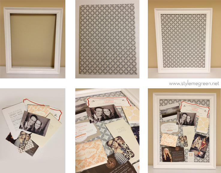 I have a box in my office filled with notes and cards that I like to keep around for inspiration. I find it helpful if I am stumped on the wording to a wedding announcement, need a reminder on a friend's child's birth date, or need an idea for a color palette. You'd be surprised how many small things you can find inspiration in. But first you have to get them out of the box. I have been meaning to make a pin board for a while and finally got around to it on Sunday, while watching the latest Mad Men. It really is that easy, it took about 20 min, excluding painting the frame. So here's how: